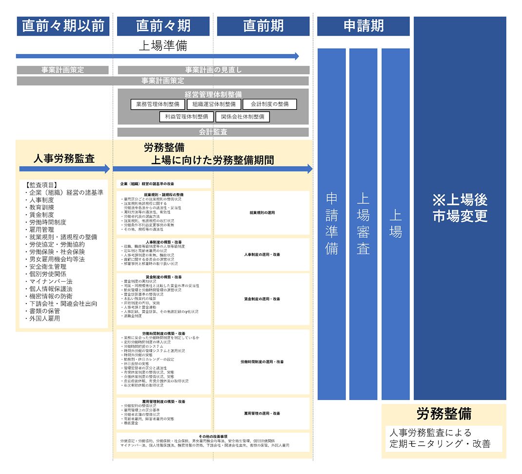 近年、IPOの上場申請時における人事労務に関するコンプライアンス審査が厳しくなっています。未払い残業代等に対する債務が無い旨も求められ、労務管理施策は最優先で着手が必要な論点となります。